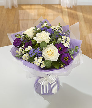 Taking inspiration from the Birthstone for February: Amethyst, our expert florists have created a simply gorgeous deep purple, mauve, lilac and cream coloured aquapack flower bouquet packed full of roses, Lisanthus and Chrysanthemums.
