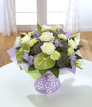 Inspired by the birthstone Aquamarine, our expert florists have cleverly created an attractive aquapack bouquet of green Anthuriums, white Roses and scented Freesias.