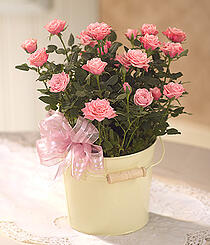 For the woman who doesn’t especially like cut flowers we have a potted mini rose plant in a pretty cream painted bucket.